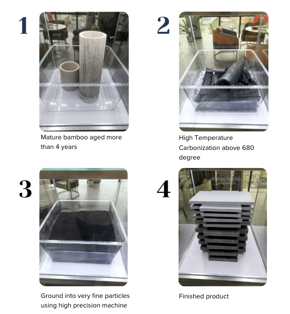 The carbonized bamboo is finely ground into powder using advanced machinery for consistent quality.Panel Compression & Finishing